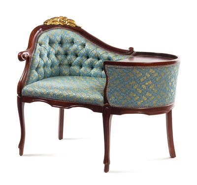 with a button tufted back and cabriole legs.