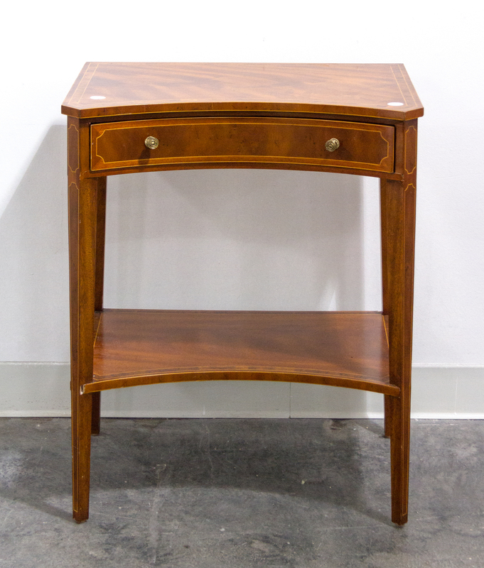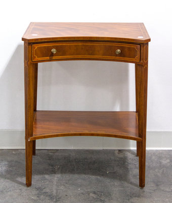 having a rectangular top with a concave front and a frieze drawer, raised on square tapering legs joined by a medial shelf.
