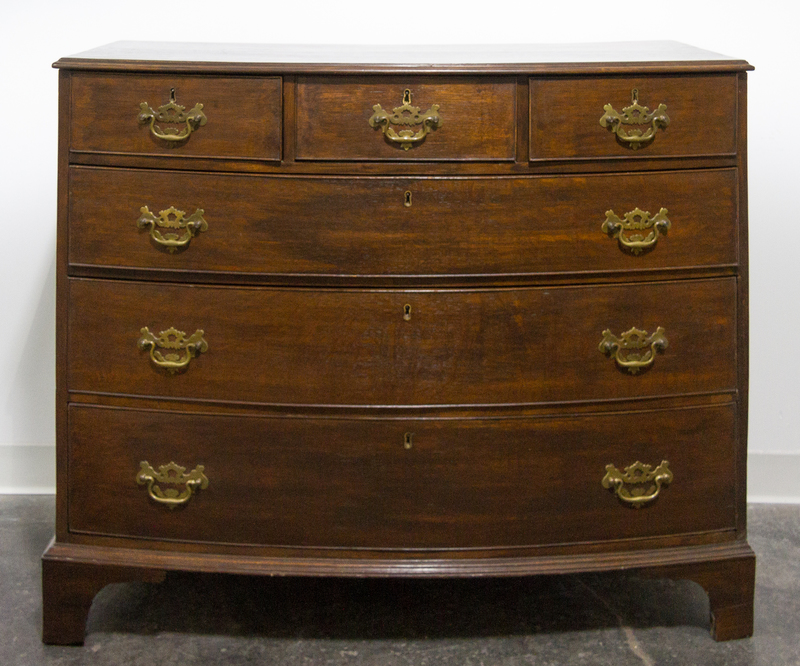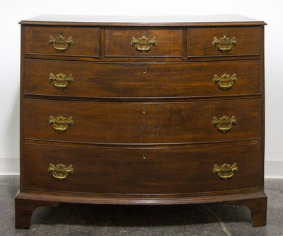 having a rectangular top with bowed front over the conforming case fitted with three short and three graduated long drawers raised on bracket feet.