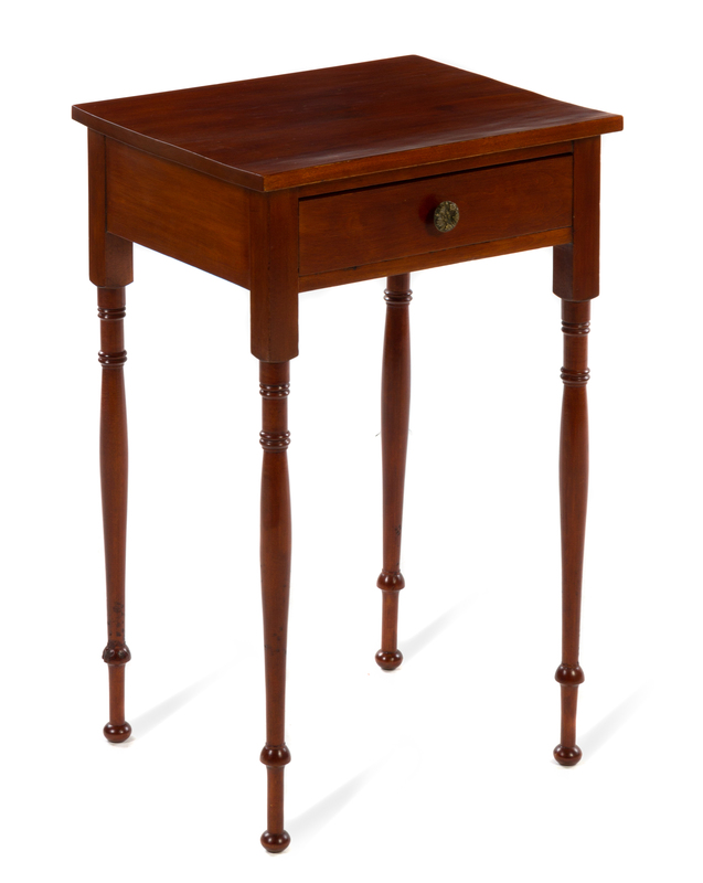 having a rectangular top over a single drawer, raised on circular ring-turned legs.