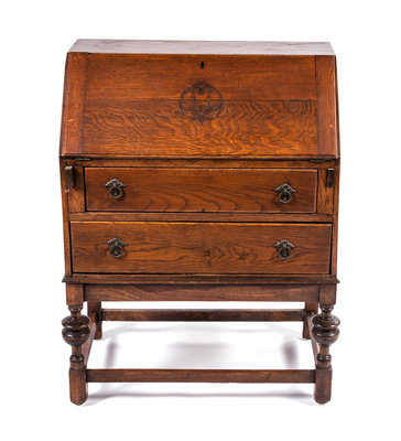 having a rectangular top over the fall front writing surface opening to a fitted interior above two drawers, the whole raised on turned legs joined by stretchers.