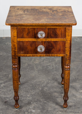 having a rectangular top over two aligned drawers raised on turned tapering legs.