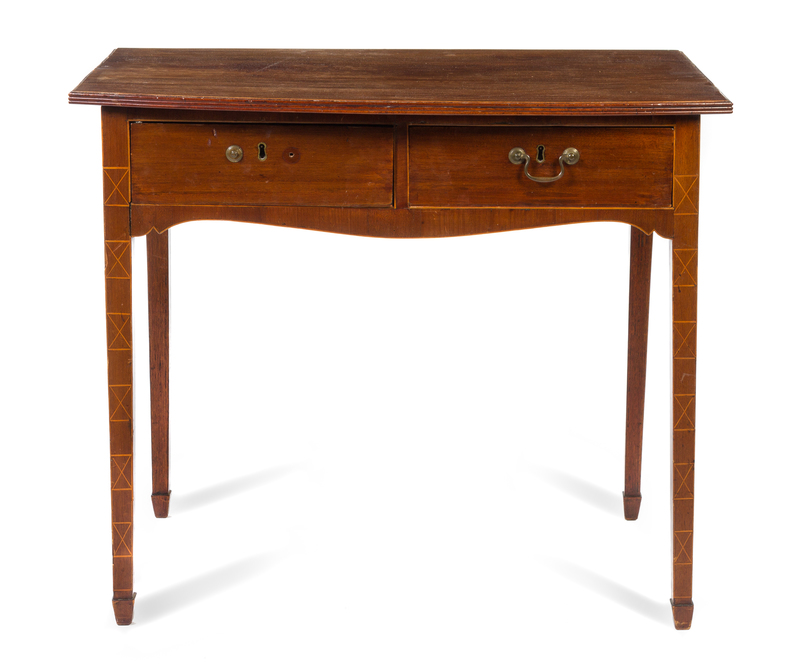 having a rectangular top with a rounded front over two aligned drawers, raised on square tapering legs.