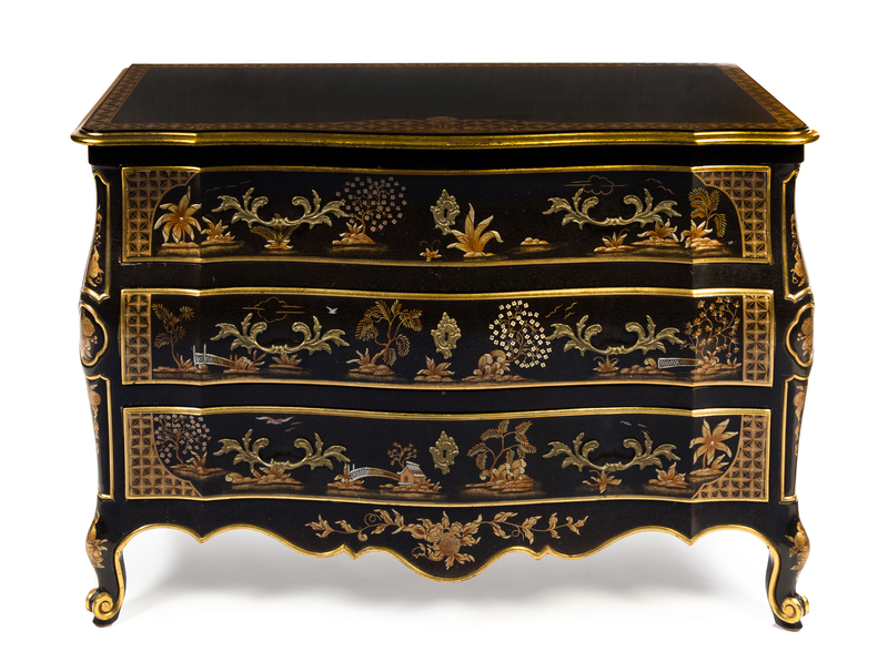 the case set with three drawers and decorated with Chinoiserie motifs throughout, raised on short cabriole legs.