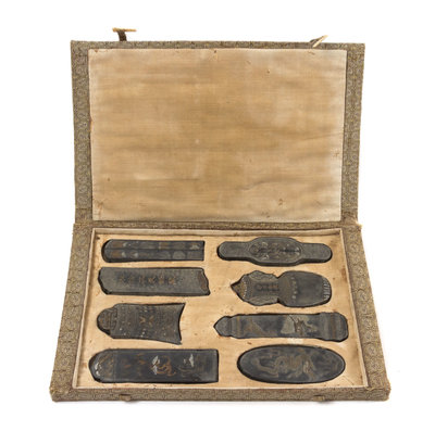 of various forms, molded in low relief, one side depicting dragons, mythical beasts, auspicious objects, bell, vase and clouds, seven ink cases with the reverse having gilt decorated inscriptions, the sides carved with a signature Hu Kaiwen (Chinese, Qing Dynasty), all fitted in a brocade box having a label written babao qizhen ("eight precious objects").
