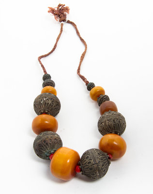 having six round amber beads and eight metal beads chased with geometric design, spaced by red hardstone beads.