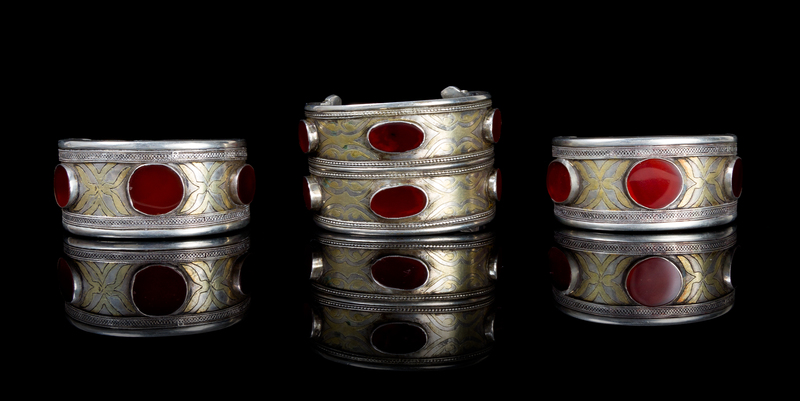 A Group of Three Carnelian Inset and Silvered Metal Bracelets
