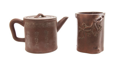 comprising a teapot of cylindrical form, having incised decoration and archaistic inscriptions, marked to the underside, together with a naturalistic brushpot of branch form having raised foliate decoration.