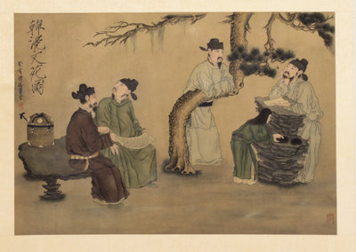 depicting scholarly figures composing calligraphy with an attendant preparing ink, in an outdoor setting beneath a pine, having calligraphic inscription and signed with a seal to the upper left.