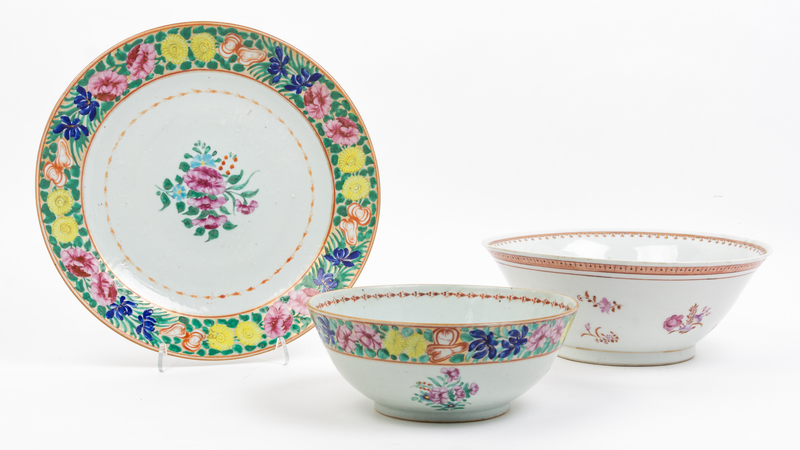 comprising a bowl of gently sloping form with a coat of arms at the front and a bowl of circular form with a band of flowers and a similarly decorated charger.