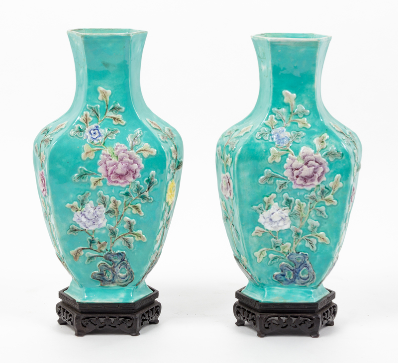 each of faceted baluster form modeled with relief flowers on a turquoise ground, raised on pierce carved wood stands.