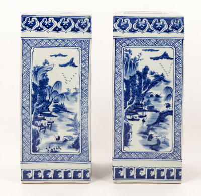each of rectangular form decorated with an aquatic landscape against a diaper pattern ground.