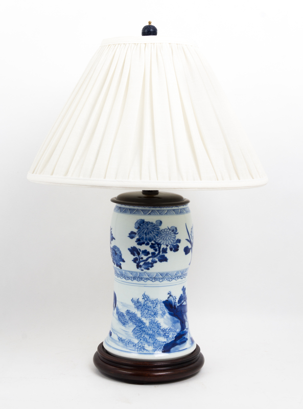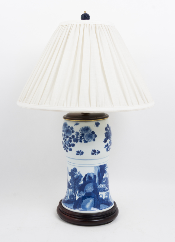 each of waisted form, painted with floral sprigs above a landscape scene, mounted as a lamp.