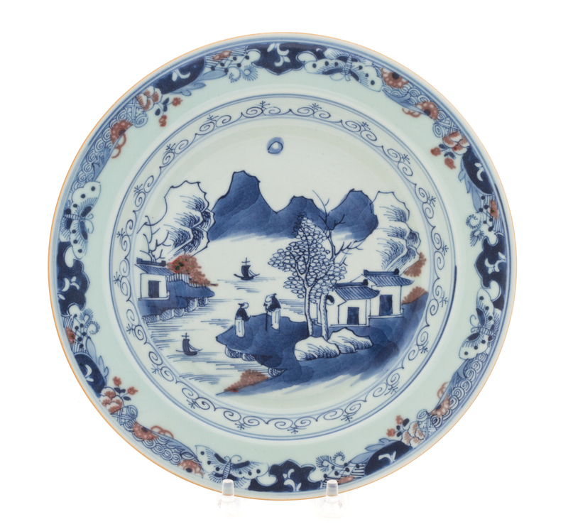 the central circular panel depicting figures in a riverscape scene, the border decorated with butterflies and flowers.