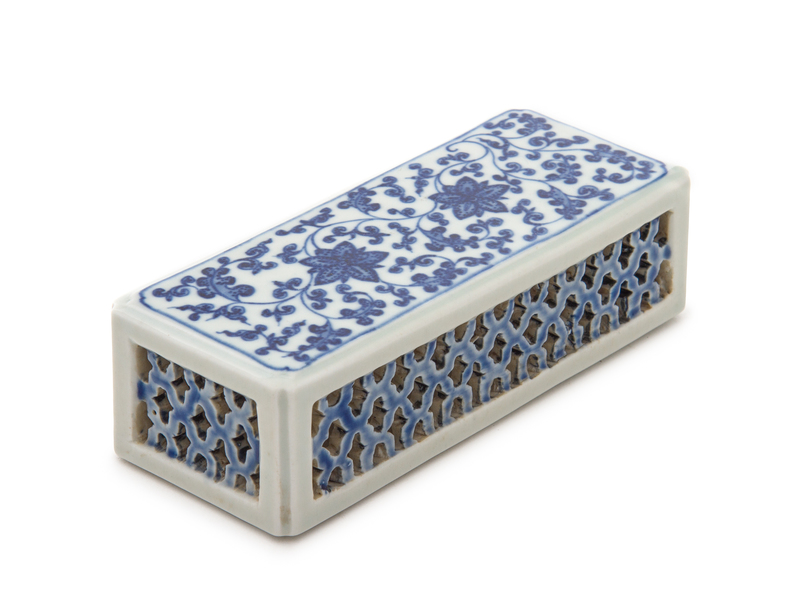 of rectangular form, painted to the top section with floral scrolls, having an openwork decoration to four sides, bearing a six-character Qianlong mark in underglaze blue to the underside.