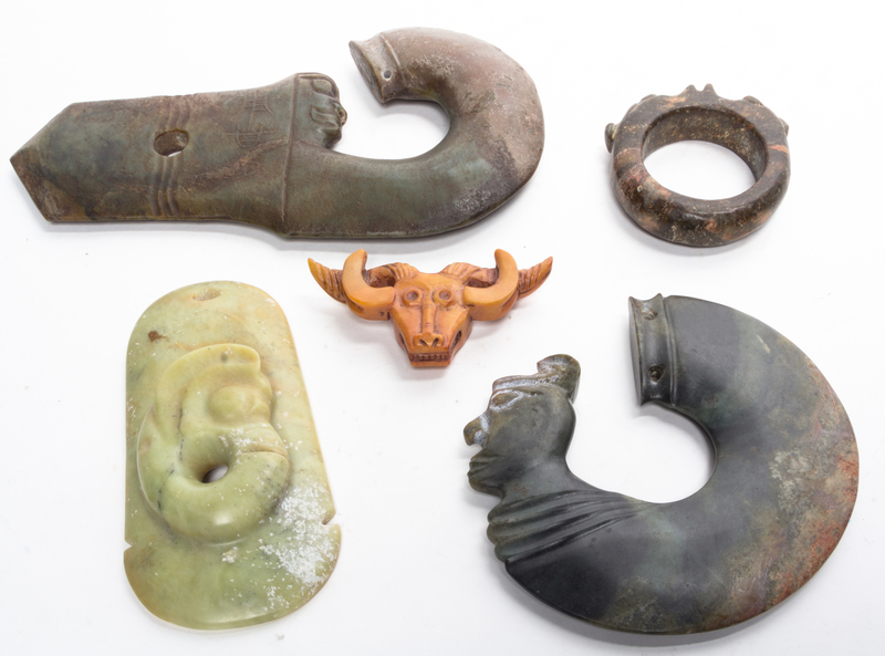 comprising four pendants depicting stylized dragons and a toggle in the form of bull's head.