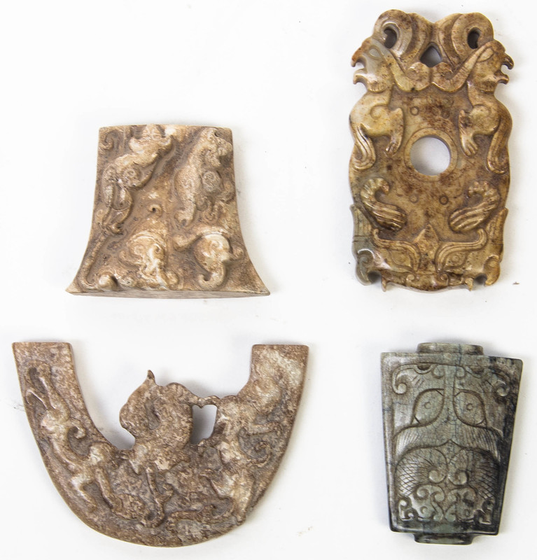 comprising a chicken bone jade toggle having a relief carved beast mask decoration, with three hardstone articles depicting chilong and taotie mask in high relief.