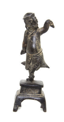 the figure depicted with a circular cap and large hoop earrings, his robes having long, draped sleeves and secured with a cord belt, in a dance pose with one booted foot and one arm raised, the figure raised on a square base with recessed, leiwen patterned sides and shaped bracket feet.