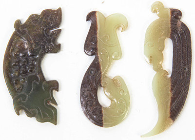 the first a knot pick in celadon and russet hardstone, depicting a coiled chilong, a celadon and russet hardstone toggle with relief carved scrollwork, and a russet and celadon jade toggle with addorsed lion heads.