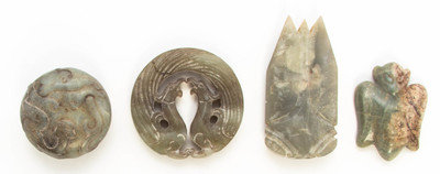 each of a mottled celadon stone, comprising a cicada, a bird toggle, and two other examples.