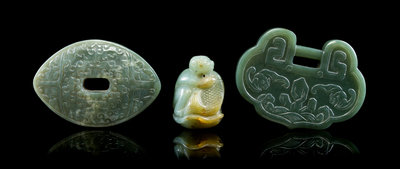 each of a green stone, the first a lock-form pendant with relief carved bats and an auspicious inscription, the second of rounded lozenge form with relief-carved C-scrolls and a pierced center, the third a monkey with a fish and lotus root.