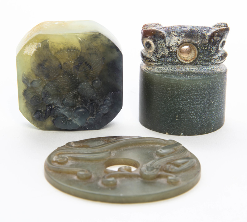 comprising two seal stamps, the first with relief carved bird and lingzhi, the second with a Liangzhu style carved beast, with a bi having sinuous chilong in relief.