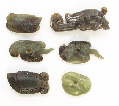 comprising two russet and celadon toggles with chilong in relief, two fish toggles, a Neolithic style beast form toggle and a celadon stone snake.