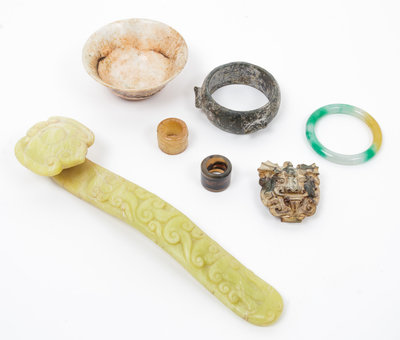 comprising archer's rings, bangles, a belt hook, a bowl with base and a scepter.