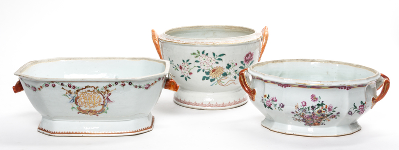 comprising three tureens without covers, each having two handles and polychrome floral decoration, one monogrammed MPM, all unmarked.