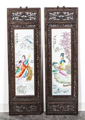 each of rectangular form, painted to depict four Chinese beauties Xishi, Wang Zhaojun, Diao Chan, and Yang Yuhuan, each within a different setting, signed Wang Dafan (Chinese, 1888-1961), mounted in a hardwood frame.