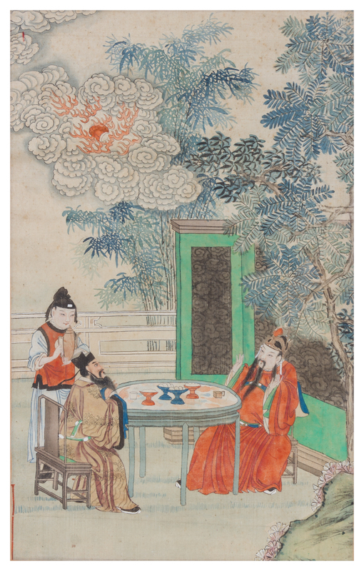 depicting two scholars seated under trees within a garden setting, enjoying a banquet with an attendant standing beside, below a flaming pearl amongst clusters of ruyi head clouds, framed.