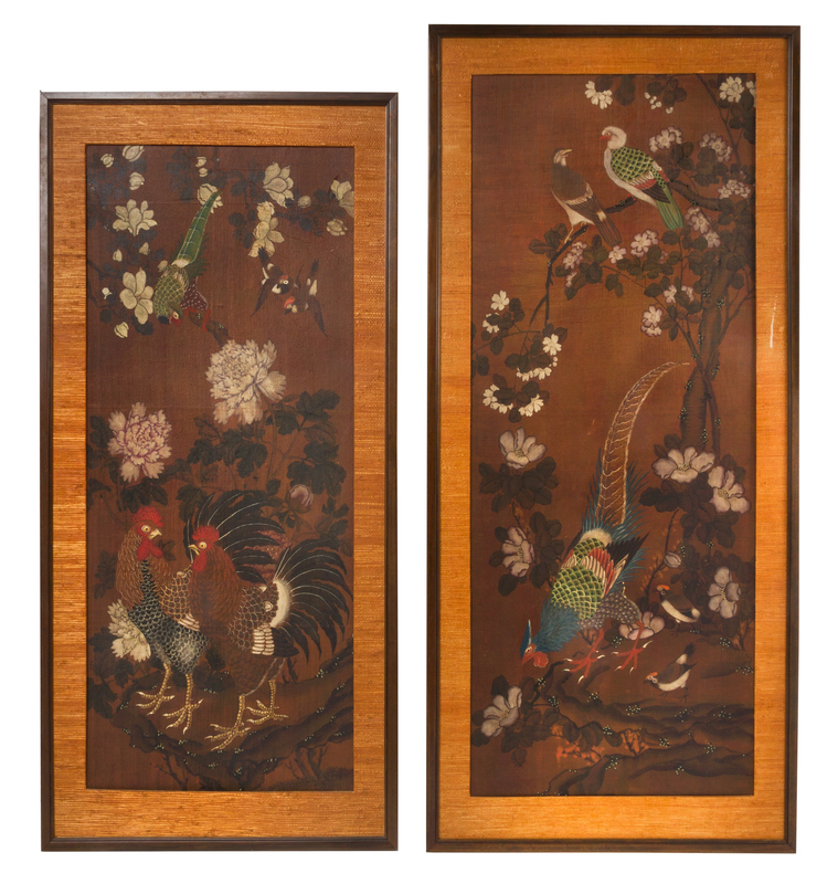 the larger one depicting birds perched on blooming prunus trees with pheasant and birds amongst flowering branches, the smaller depicting birds resting on branches with two others in flight and roosters amongst peony blossoms, framed.