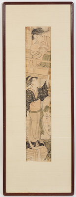 depicting two women, one on a balcony holding a fan and the other standing below, matted and framed.