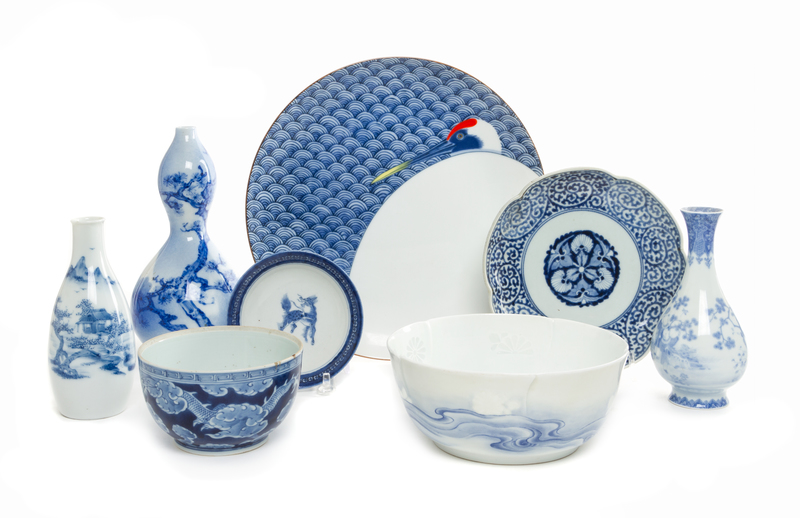 A Group of Eight Blue and White Porcelain Table Articles