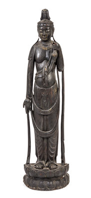 the figure depicted holding a bottle vase in draped robes and sashes, raised on a lotus base.