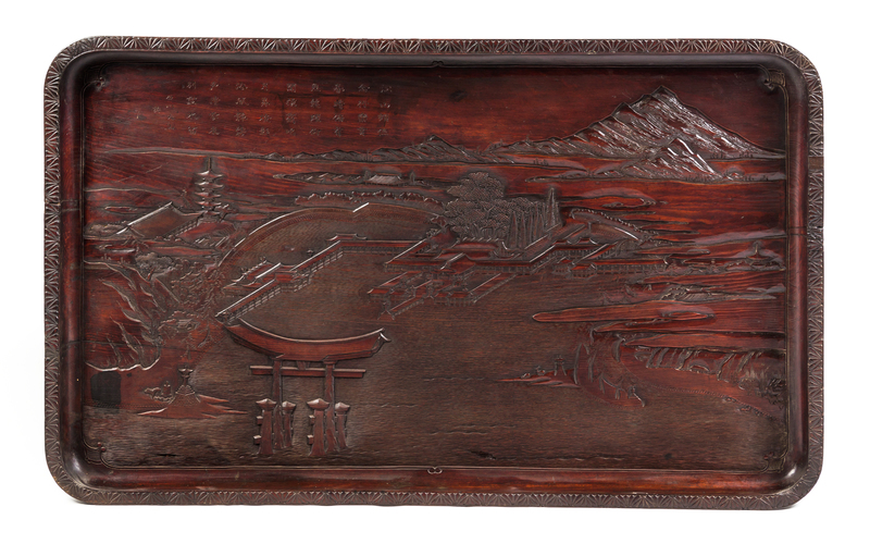 of cartouche tray form, having relief carved landscape decoration, depicting a city gate with pagoda and mountain in the background, with carved calligraphic inscription to the upper left.