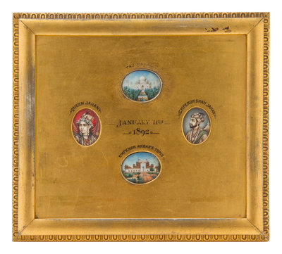 Taj Mahal, Emperor Shah Jahan, Emperor Akbar's Tomb and Queen Jahan, framed as one.
