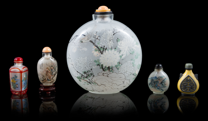 comprising a black overlay yellow example, three small inside painted examples and a large rounded inside painted example.