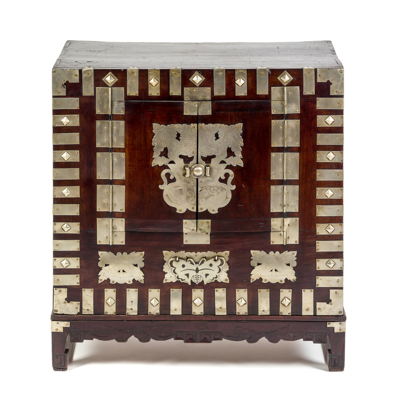 of cube form having silver metal mounts and strap hinges throughout, the double doors having a tripod censer form lockplate above the drawer with butterfly pull and mounts, raised on tapering squat legs.