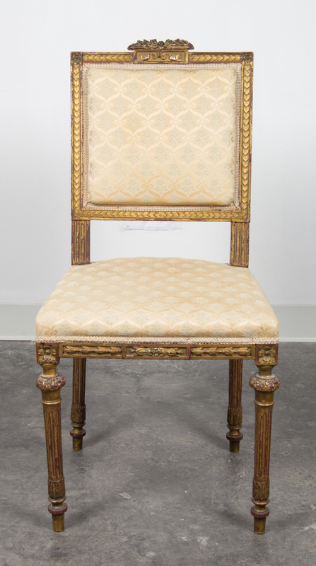 having a ribbon tied foliate crest above a padded back and a stuffover seat, raised on fluted cylindrical legs.