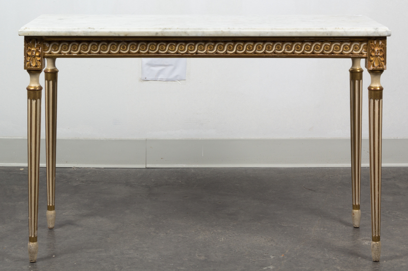 the rectangular white marble top above a running coin frieze, raised on fluted tapering legs.