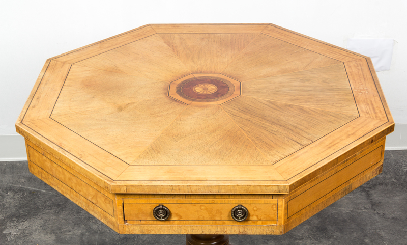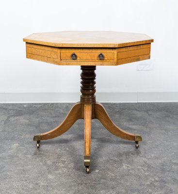 having an octagonal top with opposing drawers, raised on four splayed legs ending in brass caps and casters.
