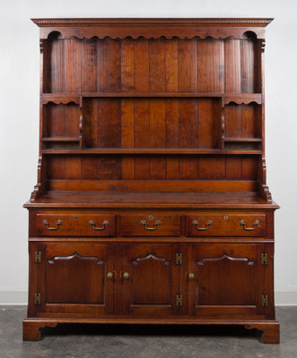 in two parts, the superstructure having a molded cornice above a series of shelves and two drawers, the base fitted with three drawers over three paneled drawers, raised on ogee bracket feet.