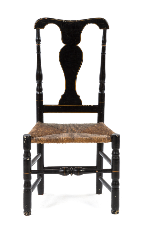 having a shaped crest rail over a vasiform splat and a trapezoidal rush seat, raised on turned legs joined by stretchers.
