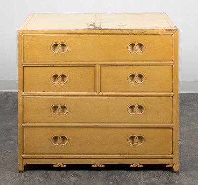 each having a rectangular top over a series of graduated drawers with inset interlocking ring pulls.