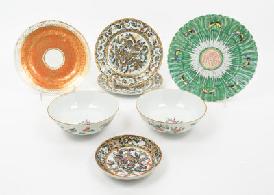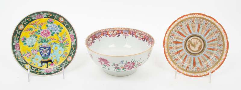 having internal and external floral decoration, together with a pair of 20th century Chinese porcelain bowls and a collection of 20th century Chinese and Japanese porcelain plates and saucers.