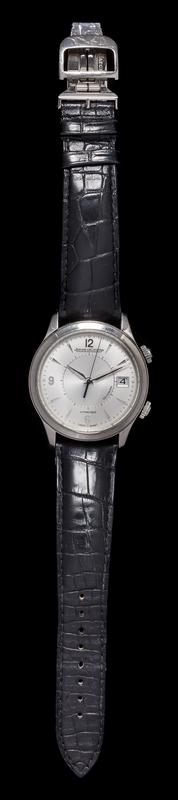 40.00 mm case diameter, two piece dial composed of an independently rotating central matte silvered section for alarm set indication within an outer matte silvered chapter ring signed JAEGER-LeCOULTRE, applied silvered Arabic and lancet numerals, date aperture at 3 o'clock, alternating brushed and polished silvered dauphine hands with center sweep seconds hand, crowns in the outer band at 2 and 4 o'clock for alarm set/wind and time set/wind respectively, polished circular case, concave lugs, screw on case back, Cal. 956 self-winding 22 jewelrhodium plated movement with fausses ctes finish signed JAEGER LeCOULTRE, black crocodile strap signed JAEGER LeCOULTRE, steel double deployant clasp signed JAEGER LeCOULTRE.Accompanied by Certificate of Guarantee showing purchase in December 2011, booklet, inner case and outer box, all signed Jaeger LeCoultre, together with an additional brown crocodile strap.