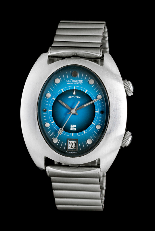 41.00 x 37.00 mm case dimensions, two section dial with center turning alarm indication dial graduating from blue to black within the outer oval dial graduating from blue to black and signed LeCoultre, applied polished and Clous de Paris finish silvered dot numerals with inner luminous block chapter ring, date aperture at 6 o'clock, luminous silvered eccentric dauphine hands with center sweep seconds hand, brushed tonneau case, two crowns in the outer band at 2 and 4 o'clock for alarm wind/set and time/date wind/set respectively, screw on case back, Cal. 916 self-winding 17 jewel rhodium plated movement adjusted to three positions and signed LeCoultre Co., later brushed steel link bracelet, deployant clasp.Note:The HPG on the dial indicates the "high beat movement" with a rate of 28,800 bph. The LeCoultre signature indicates manufacture for the U.S. market.