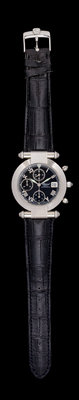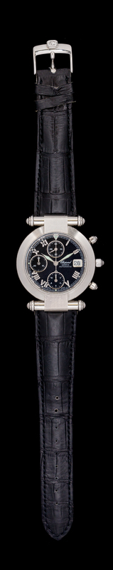 37.00 mm case diameter, matte black dial signed Chopard, outer minute and 1/5th seconds track, applied silver Roman and luminous dart numerals, luminous sword hands with center hand for chronograph seconds, subdials for 6, 9, and 12 o'clock for chronograph hours, minutes and seconds respectively, date aperture at 3 o'clock with magnifying crystal in dial, brushed and polished case, barrel lugs, case back affixed with eight screws, self-winding movement, black alligator strap signed Chopard, silver tone tang buckle.Accompanied by an extra black patent alligator strap and box, both signed Chopard.