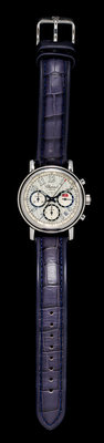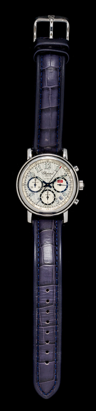 39.00 mm case diameter, silvered oeil-de-perdrix dial signed Chopard, luminous Arabic numerals and outer tachometer register, date aperture between 4 and 5 o'clock, subdials at 3, 6 and 9 o'clock for seconds, chronograph hours and chronograph minutes respectively, luminous blued steel pencil hands with center chronograph seconds hand, polished circular case, straight lugs, case back with exposition crystal affixed with eight screws, Cal. 2894-2 self-winding 37 jewel rhodium plated movement adjusted to four positions with oeil-de-perdrix finish and a fausses ctes finish rotor signed Chopard, padded blue calfskin strap, steel tang buckle.Accompanied by a case signed Chopard.